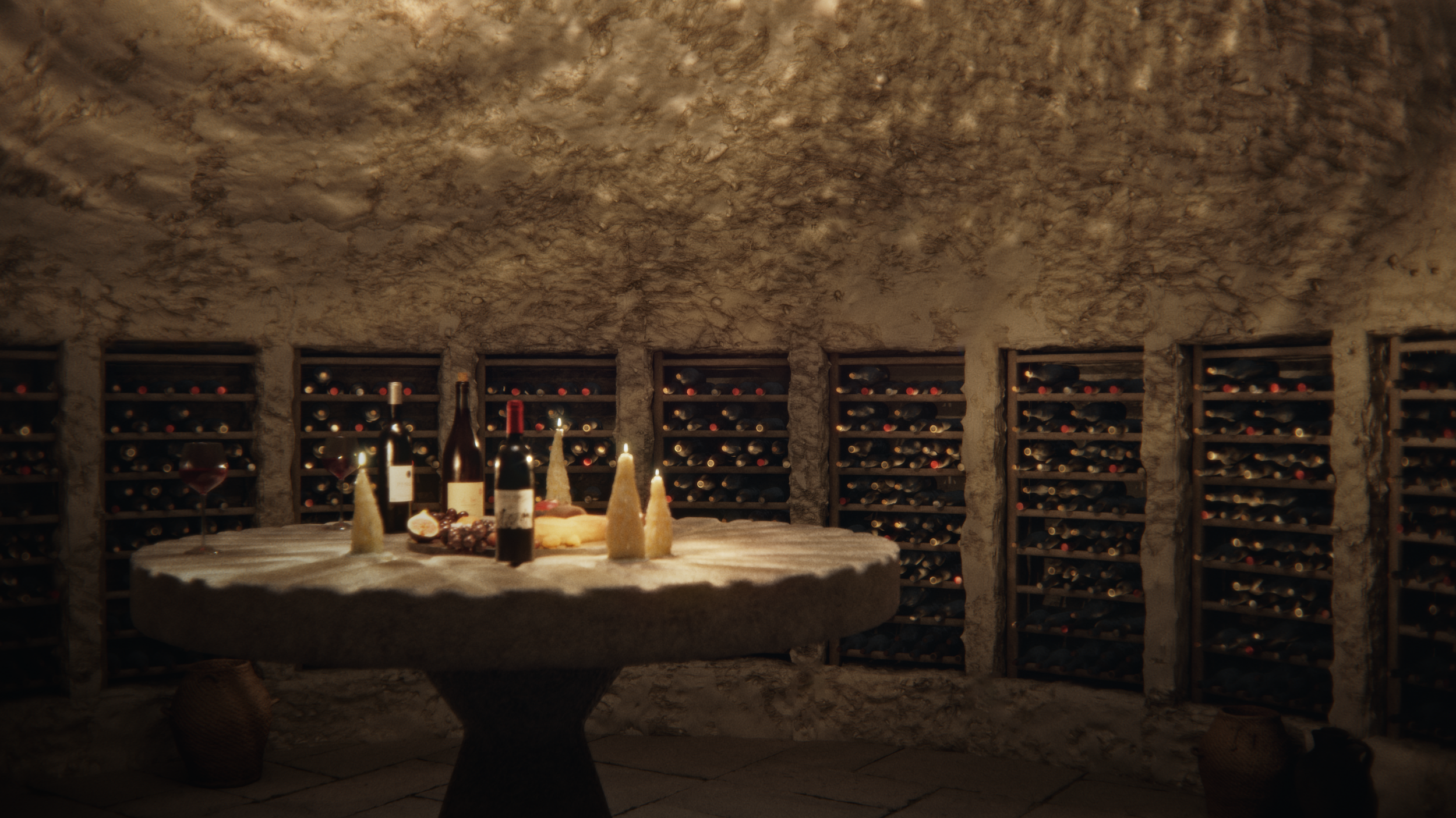 A set of interior renders for a small underground cylindrical water cistern located beneath a villa, now converted into a wine cellar.
